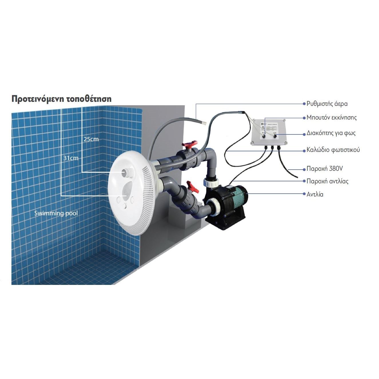Σύστημα αντίθετης κολύμβησης έως 80μ3/ω με led φως λευκό Ρυθμιζόμενη παροχή, Ενδείκνυται για τοποθέτηση σε ιδιωτικές δημόσιες πισίνες & γυμναστήρια. Στην τιμή περιλαμβάνεται ολόκληρο το σώμα και το control box και δεν περιλαμβανεται η αντλία
