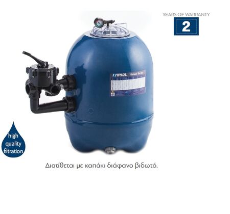 Πολυεστερικό φίλτρο άμμου για ιδιωτικές πισίνες. Χαρακτηριστικά: Βέλτιστο υδραυλικό σύστημα για φίλτρανση υψηλής ποιότητας. Μεγάλο άνοιγμα για εύκολη συντήρηση. Συμπεριλαμβάνονται πολλαπλή βαλβίδα 6 θέσεων, μανόμετρο και εξαερωτικό. Απόλυτα σταθερό χάρη στην υποστήριξη τριών σημείων στη βάση του φίλρου. Βέλτιστη διανομή ύδατος χάρη στον διανομέα νερού διπλής πλευρικής διάχυσης. Βραχίονες συλλογής, ταχείας σύνδεσης και εύκολης αντικατάστασης. Εσωτερικό ενιαίο στοιχείο, χωρίς συγκολλήσεις. Ευρεία αποστράγγιση, δεν απαιτούνται εργαλεία για το άνοιγμα, εύκολη συντήρηση.