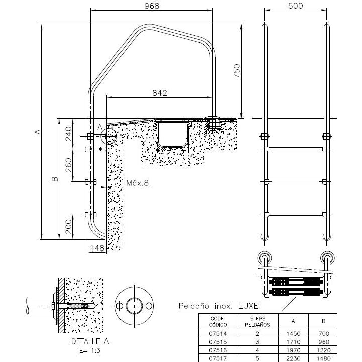 Σκάλα υπερχείλισης της Astralpool με 5 σκαλοπάτια πλάτους 500mm με χειρολαβές από ανοξείδωτη σωλήνα Φ43mm γυαλιστερή. Σκαλιά από ανοξείδωτο χάλυβα 316 . Ο τέλειος σχεδιασμός της εξασφαλίζει αντιολισθητική προστασία. Σύμφωνα με το πρότυπο EN 13451 Περιλαμβάνει τα εξαρτήματα εγκατάστασης και προσαρμογής.