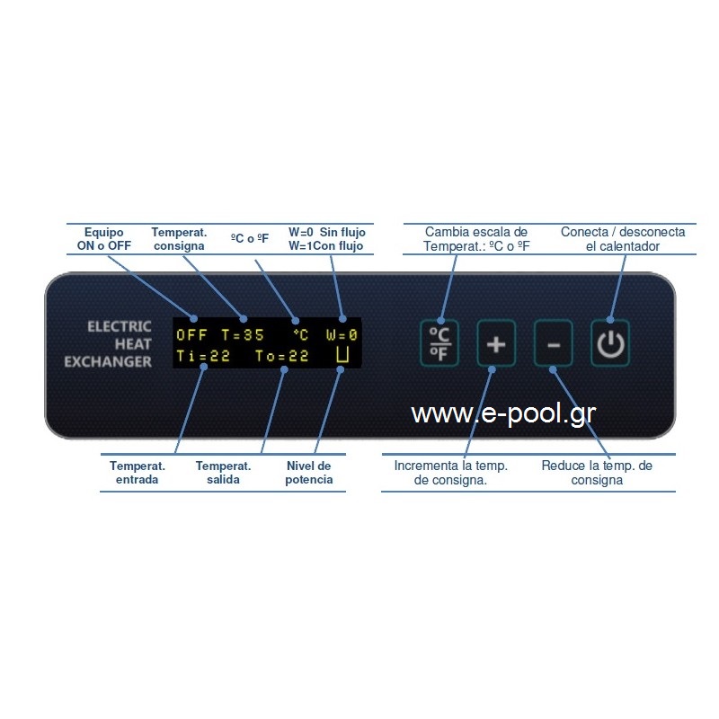 Compact Ηλεκτρικός θερμαντήρας της AstralPool Σύστημα θέρμανσης πισίνας ή spa από 18ΚW εύκολης εγκατάστασης. Σώμα απο ανοξείδωτο χάλυβα AISI-316 και θωράκιση Incoloy 825. Χάρη στο all in one σχεδιασμό του είναι εύκολο στην χρήση, ποιό συμπαγής και η γραμμική του διαμόρφωση καθιστά την εγκατάσταση του πιο απλή. Βασικές δυνατότητες και λειτουργίες Οθόνη αφής OLED Επιτρέπει στον χρήστη να διαβάσει τις διάφορες παραμέτρους επιδόσεων όπως: Θερμοκρασία εισόδου και εξόδου του νερού On -Off Θερμοκρασία σε C ή F Ρυθμός ροής. Με 2 χρόνια εγγύηση απο την Fluidra Hellas AE (Astralpool)